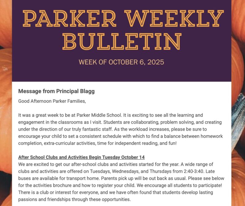 Parker Middle School Weekly Bulletin: Oct. 6, 2025 Posted October 6th, 2025 in Newsletters Parker Middle School Weekly Bulletin Back Issues 2025-26 Oct. 6, 2025 Sept. 29, 2025 Sept. 22, 2025 Sept. 15, 2025 Sept. 8, 2025 Sept. 1, 2025 Aug. 13, 2025